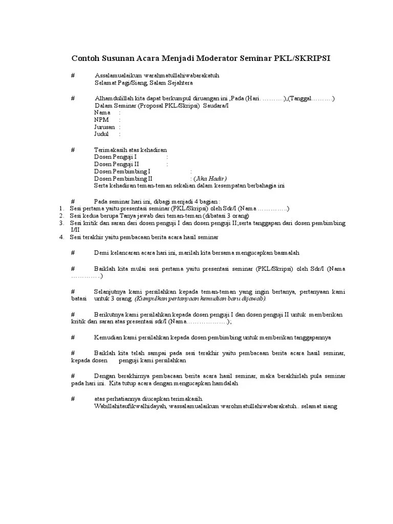 Kesempatan tanya jawab kita laksanakan dengan 2 termin, setiap termin kami buka 3 pertanyaan dan setiap pertanyaan kami berikan 2 sanggahan. Mahasiwa mengirimkan naskah proposal/naskah hasil/naskah skripsi kepada panitia/moderator dan dosen pembimbing/pembahas/penguji setelah berkoordinasi dengan panitia. Dengan adanya contoh teks mc maka yang bersangkutan menjadi. Sebagai bahan referensi atau masukan bagi anda yang baru pertama kali akan menjadi mc, berikut ini saya share sebuah contoh naskah pembawa acara formal yang bisa anda hafalkan. Tips paling penting selain berdoa agar lancar mengucapkan kalimat pembuka sidang skripsi adalah menguasai materi skripsi itu sendiri.