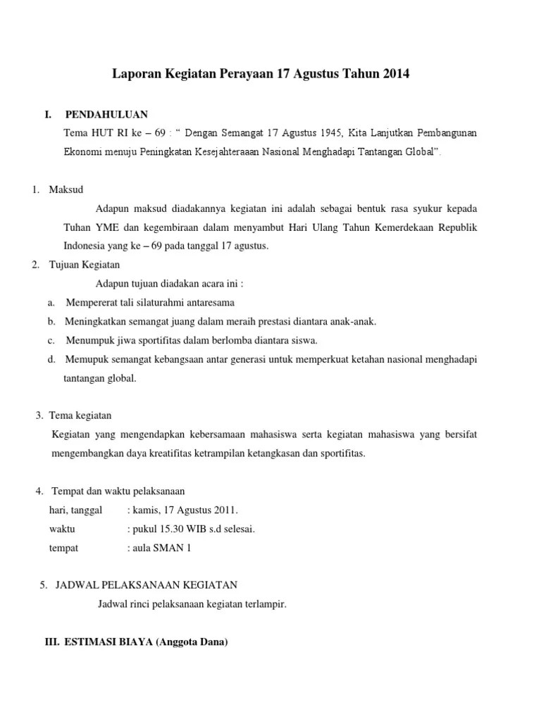 Contoh laporan hasil kegiatan 17 agustus. Lpj adalah dokumen yang berisi panitia kegiatan dan laporan keuangan suatu organisasi kepada organisasi sederajat atau tingkatan lebih tinggi. Peristiwa proklamasi kemerdekaan ri pada tanggal 17 agustus 1945 telah. Tujuan yang ingin kami capai dari kegiatan ini adalah untuk memperingati dan memeriahkan hari kemerdekaan 17 agustus 2019, . Contoh proposal kegiatan 17 agustus proposal adalah rencana yang disajikan dalam bentuk rancangan .